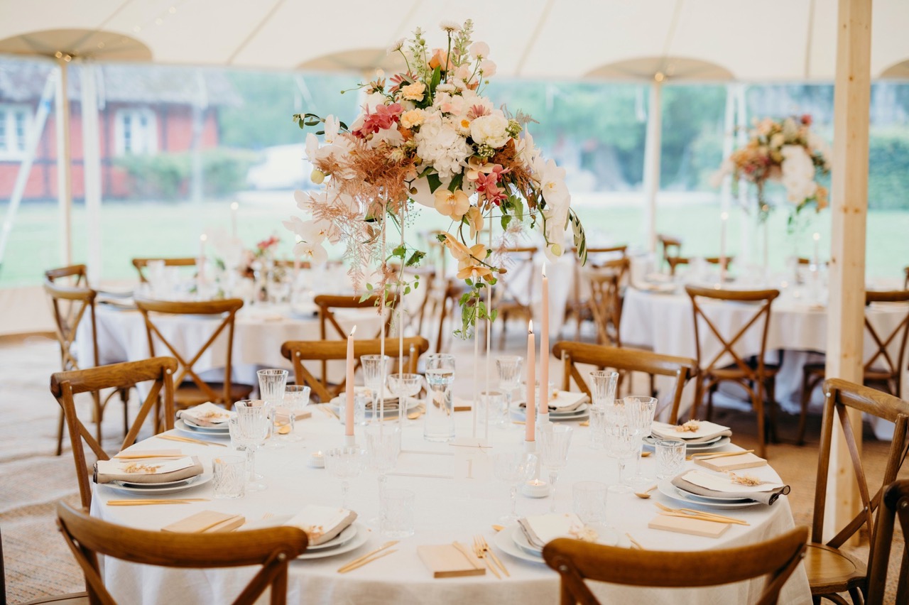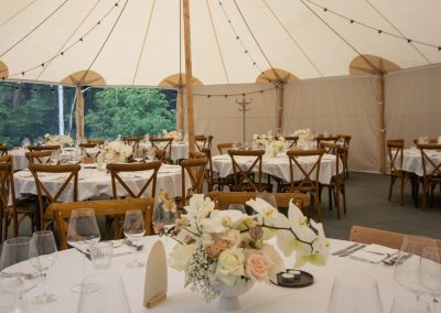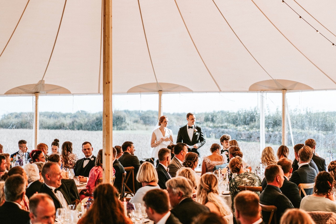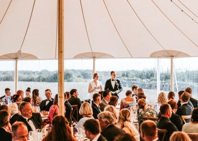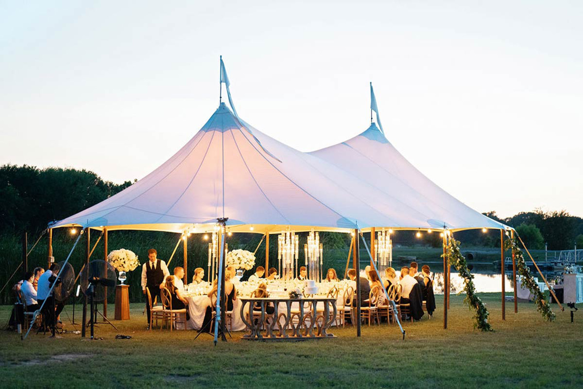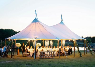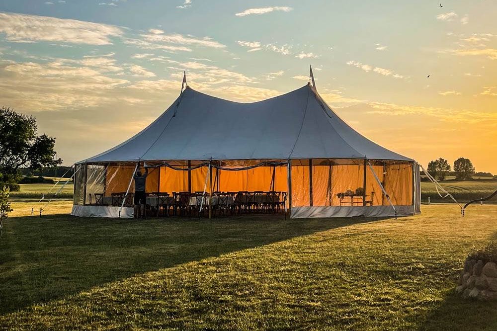 Masteteltet er et unikt telt løsning, som skaber en udtryk der er elegant med dets storslået toppe, de natur farvet duge og massive stolper i træ. Med god plads til fx /buffet, gave bord, dansegulv og band. Vi anbefaler at der ca. kan være omkring 104 personer i 10 x 22 masteteltet. Masteteltet kan (max) rumme op til 140 personer siddende, og har et samlet et areal på 179 kvm.