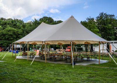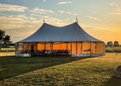 Vores Mastetelte bliver som standard leveret med sider hele vejen rundt hvoraf 50% beklædes med dug & 50% med panoramavindue. Alle sider kan rulles op i fag á 3 eller 6 m.